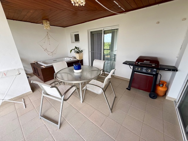 - Terraza principal con jacuzzi y área de barbacoa, con agradable vista al área verde
